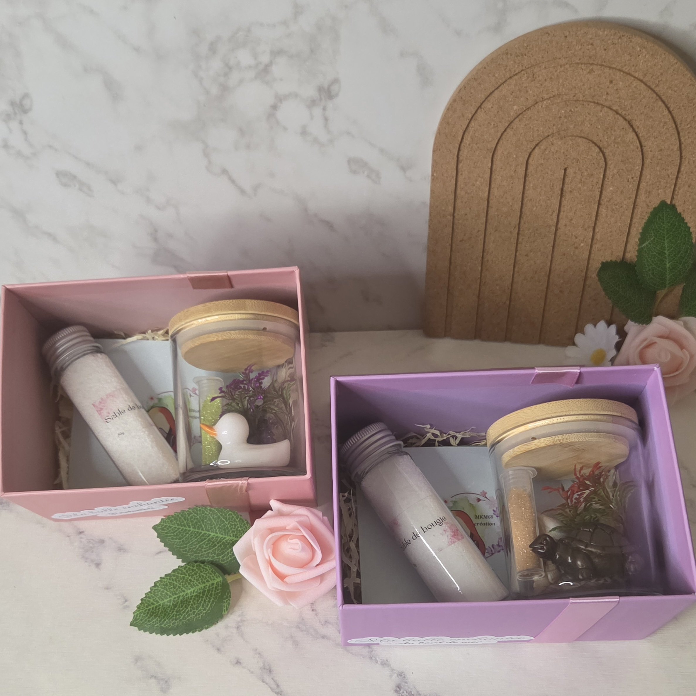 éléments décoratifs (pierres naturelle d’améthyste /fleurs / figurine canard ou tortue en résine époxy)